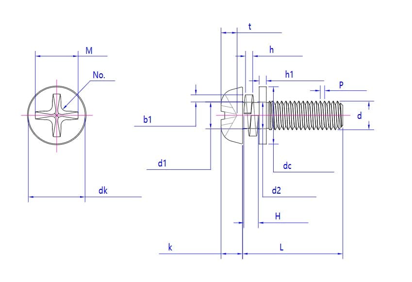 - M3: p=0,45 mm, dk maks.=5,6 mm, dk min.=5,3 mm, M=3 mm itd.